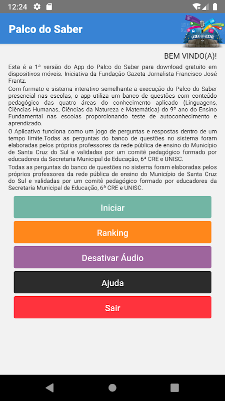 Aplicativo para download gratuito em dispositivos móveis com formato e sistema interativo semelhante a execução do Palco do Saber presencial nas escolas, o app utiliza um banco de questões com conteúdo pedagógico das quatro áreas do conhecimento aplicado (Linguagens, Ciências Humanas, Ciências da Natureza e Matemática) do 9º ano do Ensino Fundamental nas escolas proporcionando teste de autoconhecimento e aprendizado.