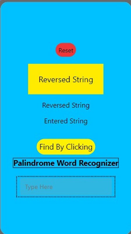 Quando abrimos o aplicativo, ele nos mostrará uma caixa de texto. Nessa caixa de texto, temos que escrever qualquer coisa e, em seguida, clicar no botão "Find By Clicking" para saber se é uma palavra palíndromo ou não. Se quisermos remover a palavra para escrever outra palavra, devemos clicar no botão "redefinir".