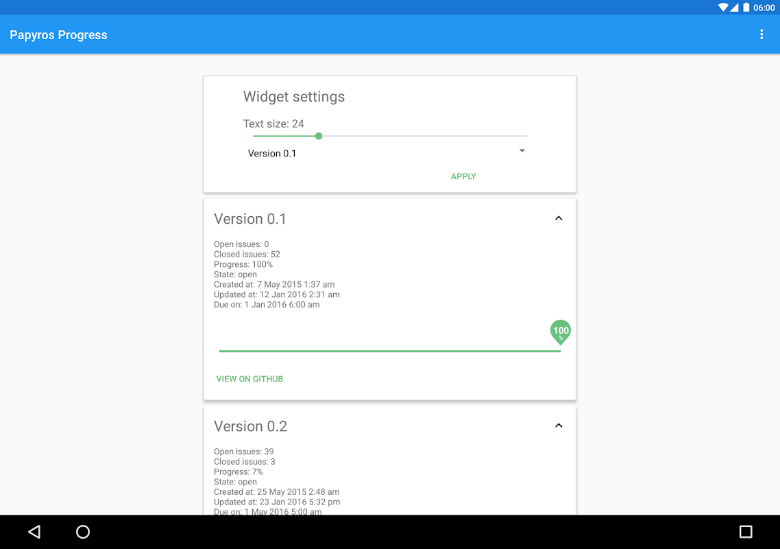 Papyros is a new operating system, currently in development. It uses Google's Material Design and is based on Arch Linux. Take a look at the homepage: papyros.io. There is a progress bar showing the progress of the next release milestone. I have created two widgets to show the progress on the home screen of your Android device.