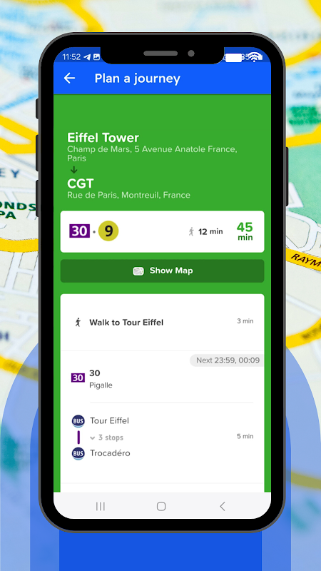 Planeje rotas facilmente em todos os meios de transporte de Paris – incluindo metrô, RER e bondes – com direções e tempos de viagem precisos.