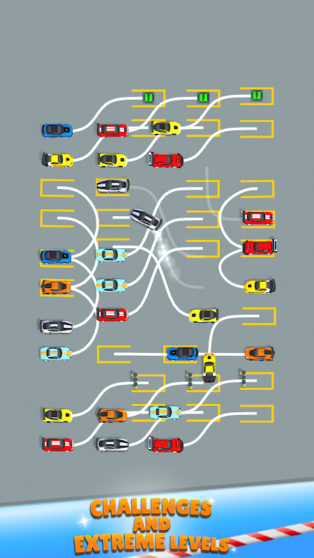 O jogo é simples e divertido: selecione o carro com o qual deseja jogar, manobre os carros tocando, estacione cada um em seu espaço designado e conclua o nível! Você pode encontrar vários obstáculos ao longo do caminho, incluindo barreiras que impedem a entrada na área de estacionamento, pedestres que precisam ser observados e obstáculos que podem ser desativados com um botão. Também pode haver semáforos e caminhões com longas trilhas em seu caminho. Esteja atento a esses obstáculos para estacionar com eficiência.
