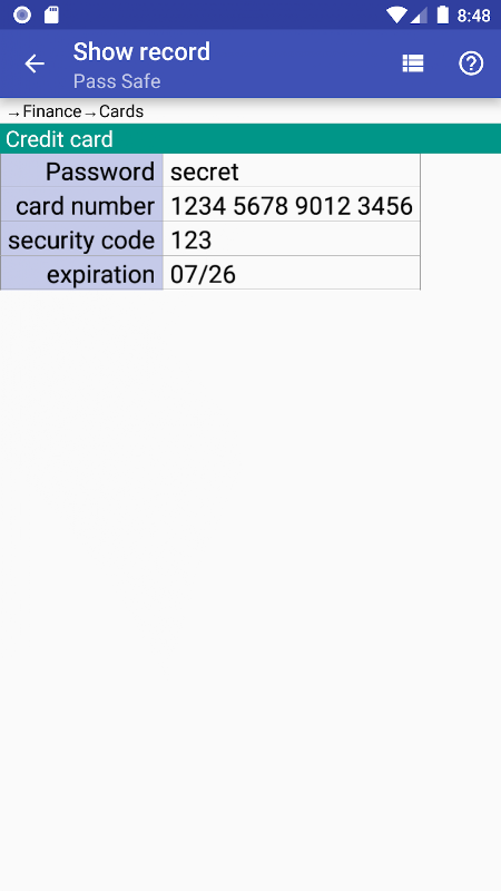 Tendo problemas para a recordar todas as suas senhas, nomes de usuário, contas, números de conta, ids de clientes, códigos de segurança, identificadores, pinos? Password Safe pode ser usado para armazenar todas as suas senhas, nomes de usuário, contas etc Tudo que você precisa saber para ter acesso é uma senha mestra. Seus dados são armazenados criptografados (AES cifra é usado) em apenas seu dispositivo.