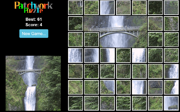 Patchwork Puzzle is a tile puzzle similar to a jigsaw puzzle but with square pieces. A picture is broken into squares that are then jumbled. Select two squares to switch their positions. Continue until the puzzle is solved.