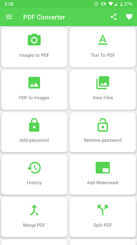 PDF Converter app allows you to convert all type of image and also text file to pdf. Also this app provides more functionality like protect pdf file using password, add watermark, merge pdf files in single pdf, remove duplicate pages and many more.
