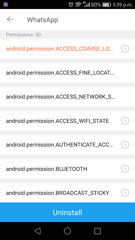 Você pode pressionar o item que requer a permissão crítico para você, ver mais detalhes sobre ela, ou desinstalá-lo.