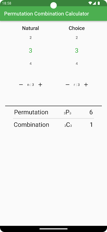 "Calculadora de Combinação de Permutação" é um aplicativo que facilita a realização de cálculos para permutações e combinações comumente usadas em matemática e estatística. Ao usar este aplicativo, mesmo aqueles que não são bons em cálculos matemáticos podem realizar cálculos facilmente.