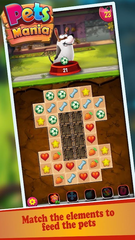 • A plethora of elements to make your pets comfortable in their respective pet homes like bath tub, bone, couches, truck, tower etc. Purchase them with the stars that you accumulate by matching 3 or more similar items in one of the best pets game on Google play store.