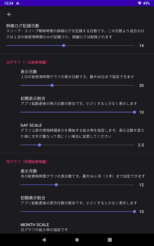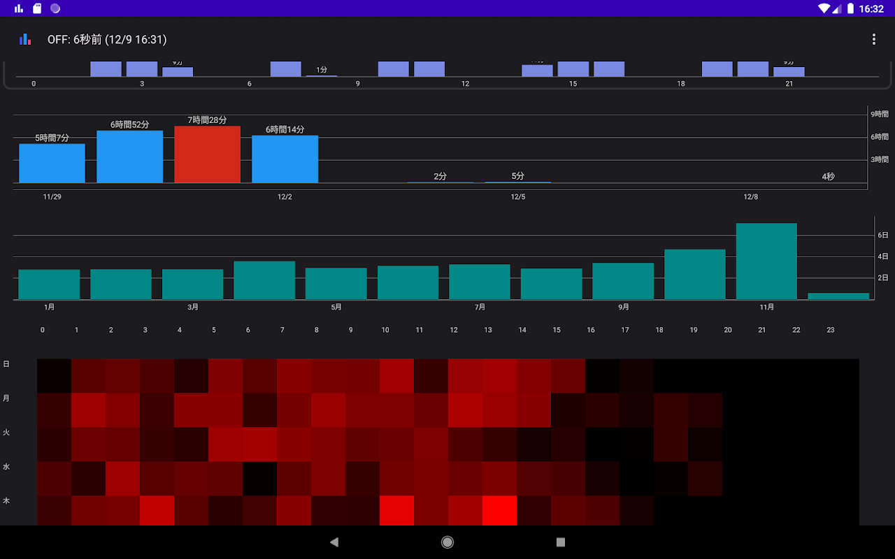 Você pode registrar a data e hora em que usou seu smartphone e verificar em um gráfico. Você pode ver a que horas adormeceu enquanto tocava em seu smartphone e quanto tempo o usou por dia. Há também um mapa de calor que mostra quais dias da semana e horários você mais usa.