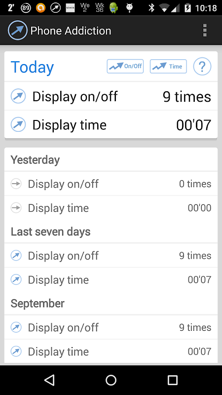 An arrow icon in the notification area in top of the display will indicate when PhoneAddiction is on an measuring.