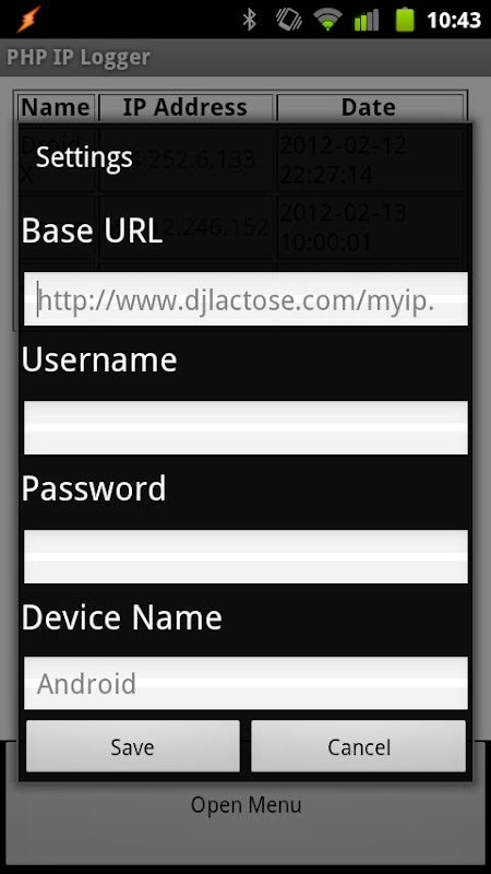 This app works by deploying a simple php script which stores the entries in a MySQL database. The php script can be found at http://www.djlactose.com/myip.phps