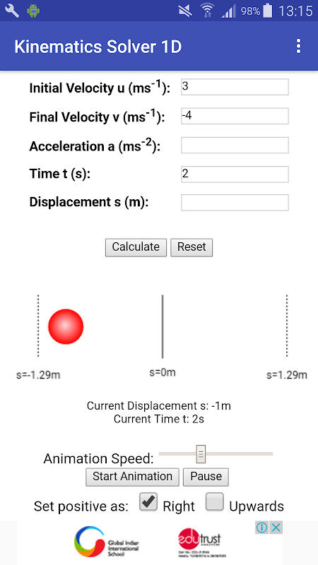 Uma solução passo-a-passo é gerada, incluindo que a equação de movimento (fora das quatro equações) e quais são os valores são substituídos em cada passo. Às vezes, há 2 soluções, o aplicativo permitirá que você sabe eo usuário pode alternar entre cada um deles usando as caixas (refeer para screenshots).