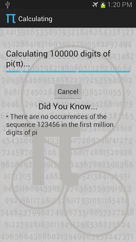 Este aplicativo permite calcular os dígitos do número irracional pi (π) em tempo real. Você pode escolher quantos dígitos deseja calcular (até 1 milhão). Ele permite que você escolha qual algoritmo usar (Chudnovsky com divisão binária, Machin usando Euler Arctan ou Machin). Use este aplicativo para se divertir ou como uma ferramenta de referência. (No meu dispositivo de teste, um Samsung Galaxy S3, leva cerca de 21 segundos para calcular 1.000.000 de dígitos usando o algoritmo Chudnovsky com divisão binária e leva mais alguns segundos para renderizar a exibição)