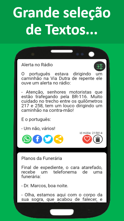 As mídias "id mídia" (textos,imagens,sons e vídeos) utilizadas pelo aplicativo, são gratuitas, disponíveis e compartilhadas pela internet/redes sociais.