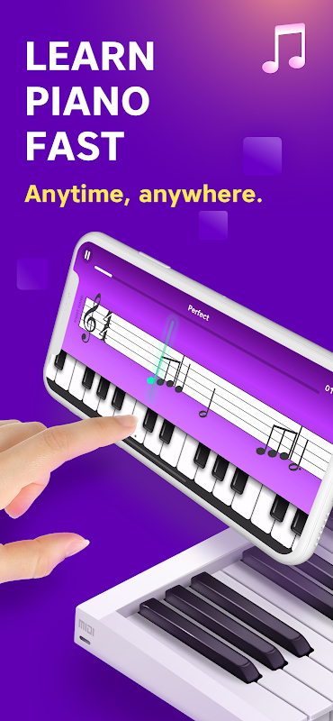 E o mais legal é o nosso player pessoal, que apresenta as notas musicais como você vê nas partituras reais. As notas são perfeitamente sincronizadas com a música de fundo, que vai acompanhá-lo no seu próprio teclado. O aplicativo escuta todas as notas tocadas e fornece um feedback instantâneo, para que você saiba (e também nós saibamos) se você acertou a nota certa, no momento certo.