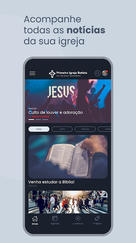 Recursos disponíveis no Aplicativo: Notícias, Agenda da igreja, Eventos, Conteúdos, Projetos, Transmissão ao Vivo e Módulo Ensino.