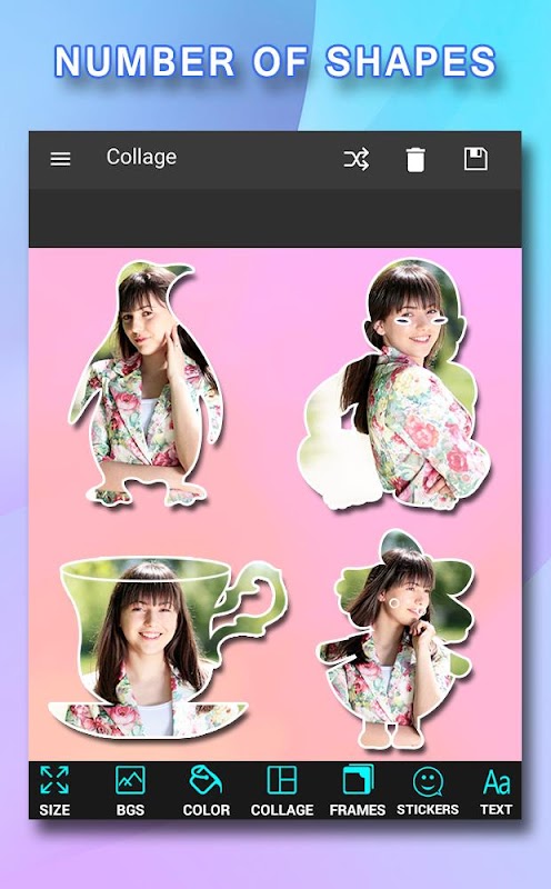 Este Pic Collage Editor permite que você crie colagens de fotos usando suas fotos, imagens, adesivos engraçados, planos de fundo, sobreposições e texto colorido. Ele ajuda você a agrupar ou combinar várias fotos em um quadro com vários efeitos e estilos de quadro. Este editor de fotos está repleto de coleções de molduras, modelos, grade e adesivos que criam uma colagem de fotos profissional instantaneamente. É uma grande coleção de molduras e formas.
