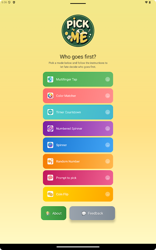 Torne as noites de jogos de tabuleiro, festas e decisões em grupo divertidas e justas com Escolha-me! Seja para decidir quem começa em uma noite de jogos de tabuleiro ou para resolver qualquer atividade em grupo, Escolha-me tira a pressão e deixa o destino decidir. Chega de discussões, basta tocar, girar ou dar uma sugestão e deixar o aplicativo fazer o trabalho!