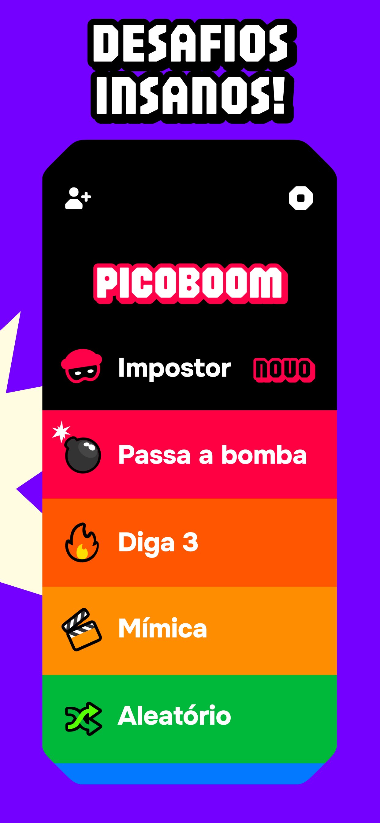 Esqueça os joguinhos de festa sem graça. O Picoboom é o verdadeiro teste de vibe do rolê: caótico, hilário e totalmente fora da caixinha. Pegue um celular, junte a galera (só 2 pessoas? top. Um grupo inteiro? melhor ainda) e se prepare para desafios insanos, roast selvagem e o momento épico de “não seja pego com a bomba na mão.”