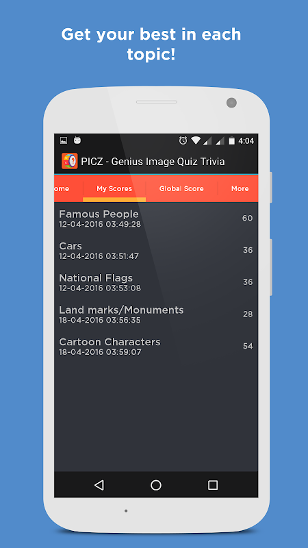 Images of famous women, men, scientists, landmarks, monuments, animated characters, football players, cars, logos, national flags and it is endless. Share your score to the world and say you are a genius!!