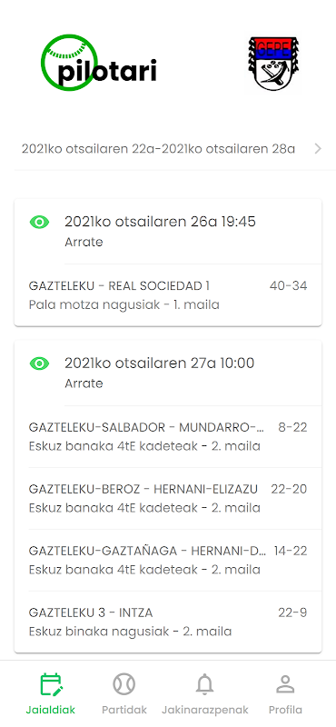 Esta aplicação permite aos clubes e juízes da Associação da Pelota Basca de Álava, da Federação da Pelota Basca de Bizkaia, da Federação da Pelota Basca de Gipuzkoa e da Federação da Pelota Basca do País Basco realizar diferentes operações.