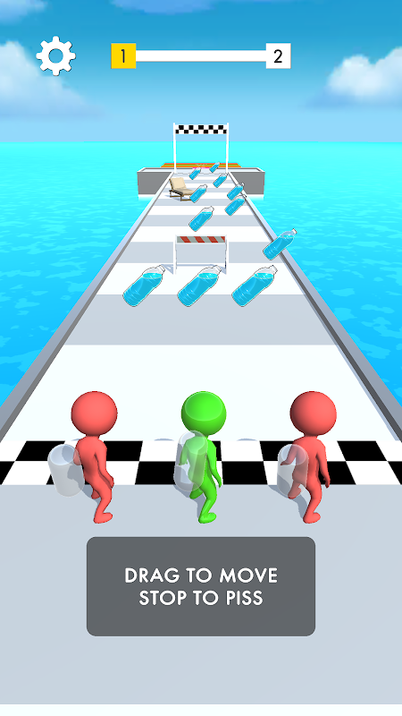 Run and piss forward to knock down opponents and come first. Pick up water bottles and piss as long as you need