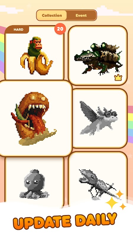 Com apenas um toque, pinte a pixel art de acordo com sua preferência. Aumente e diminua o zoom para uma visualização melhor. Deixe o jogo sugerir artes semelhantes com base nos seus interesses.