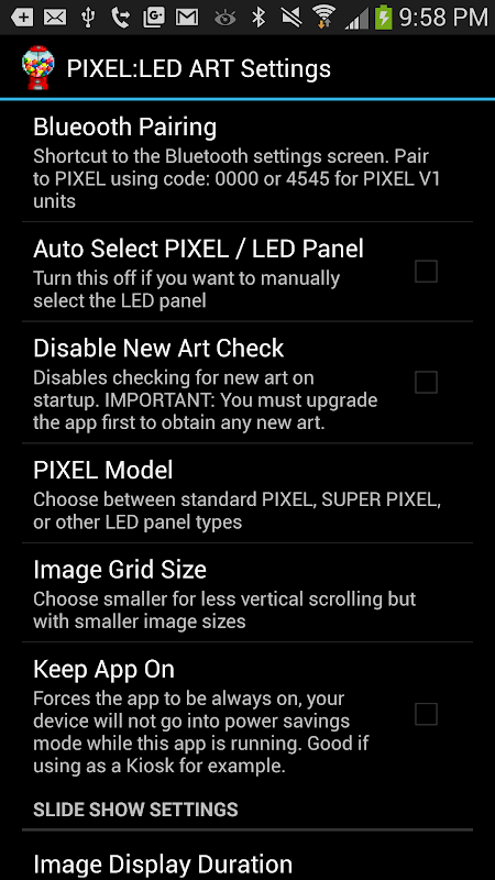 Observe este aplicativo requer um pedaço de hardware chamado o quadro PIXEL: LED ART de http://ledpixeart.com. O aplicativo enviará pixel art via Bluetooth para o quadro PIXEL LED Art.