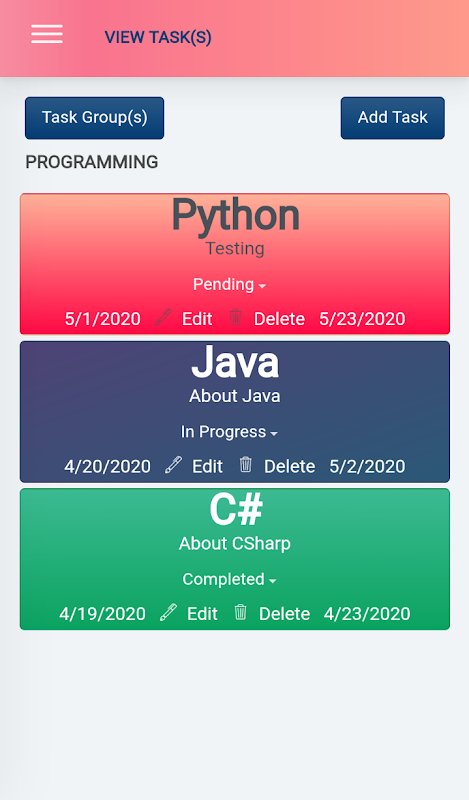 Anyone can use this application to Track their daily Work/Task easily. User can create Categories (like Study, work, Exercise) and Task Groups selecting the Category to create Task.