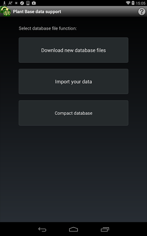1 - Download the database files for Plant Base for initial installation or update. Can be run before or after installing the main app. The files are large and a good internet connection is required. They are saved in a PlantBase directory, which will be created if necessary.