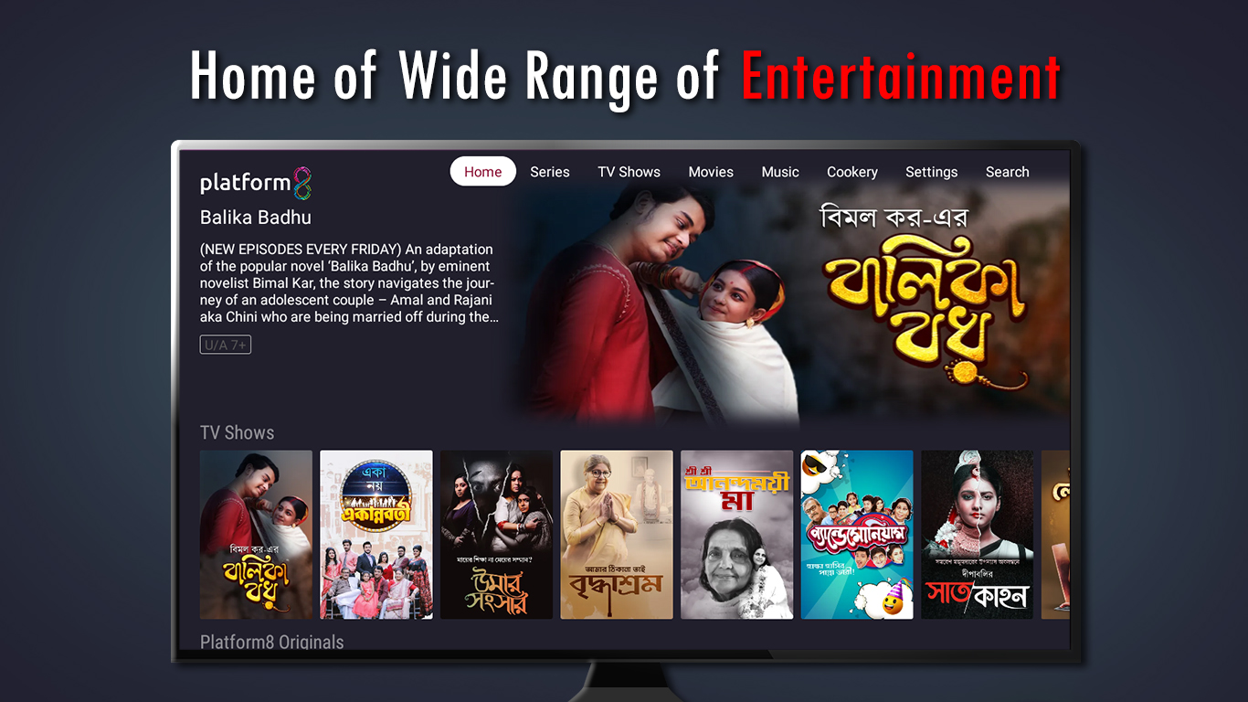 Uma plataforma de streaming de vídeo sob demanda para espectadores em todo o mundo. Um modelo baseado em assinatura freemium contendo mais de 400 horas de conteúdo de vídeo recreativo adicionado em intervalos regulares. Um pioneiro em trazer entretenimento familiar bengali para a plataforma OTT. A plataforma 8 vem com uma infinidade de opções que abrangem curtas-metragens, séries de TV, drama, thrillers, filmes clássicos, programas musicais e muito mais. Ele vem da casa de Aakash Aath e do Channel Eight - que é imensamente popular entre o público bengali há décadas.