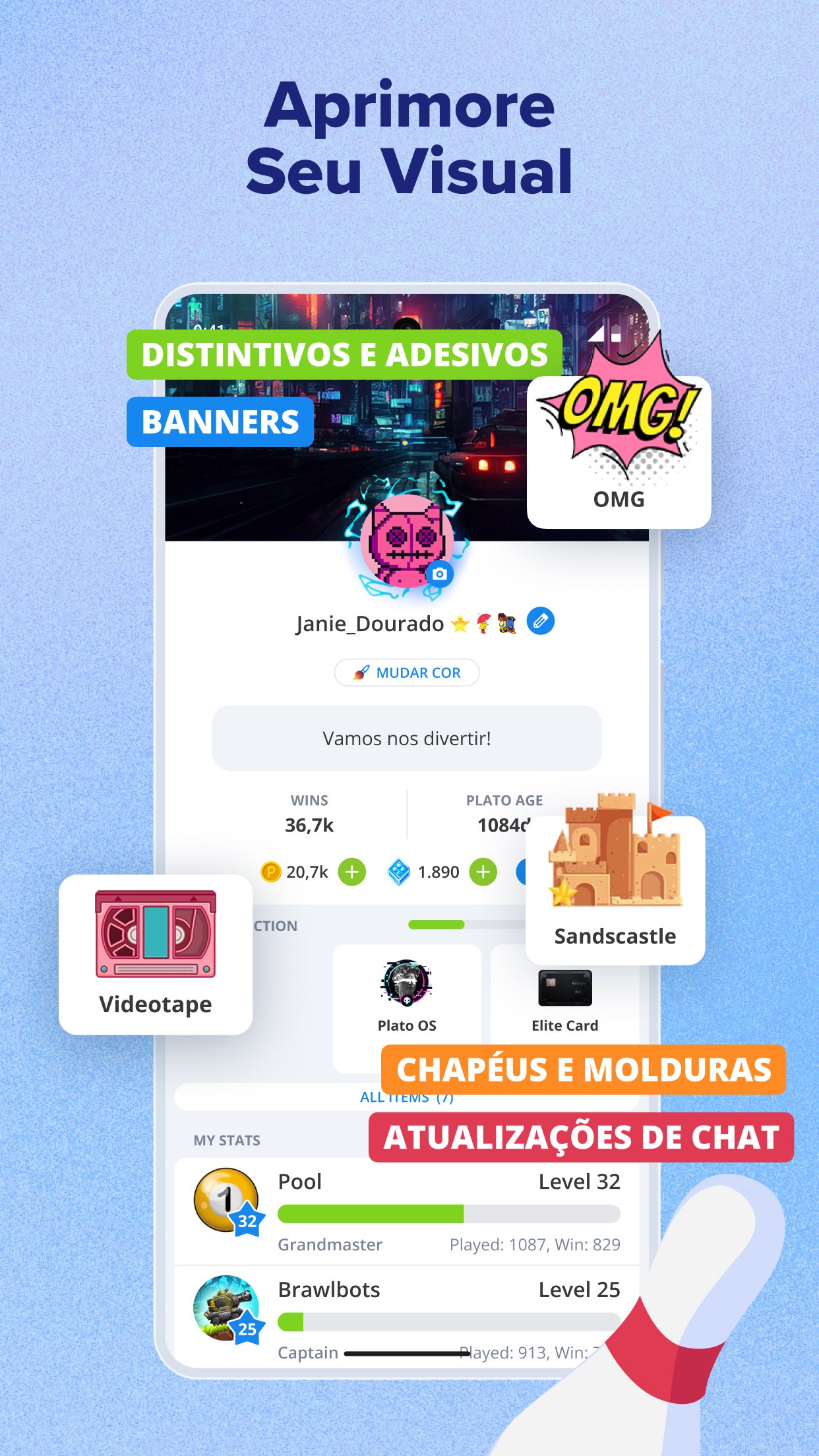 ● Paraíso da personalização: Personalize o seu perfil, os temas do bate-papo em grupo e as experiências de jogo para deixar o Plato com a sua cara.