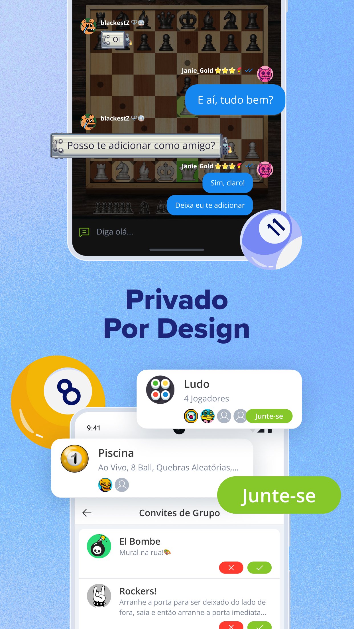 ● Privacidade em primeiro lugar: Não coletamos dados desnecessários, para que você possa jogar e bater papo com tranquilidade.