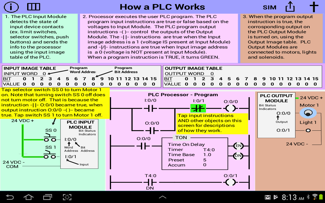 Este aplicativo foi projetado para ajudar qualquer pessoa que seja nova em PLCs e queira aprender o básico de "Como funciona um PLC" e JOGAR com um simulador simples para experimentar alguma programação simples. O aplicativo consiste em três seções principais, "Como funciona um PLC", "Diagrama de blocos do PLC" e o Simulador de PLC. O simulador PLC permite que o iniciante aprenda habilidades de programação simples com 3 temporizadores, 2 contadores, 6 instruções de comparação, 2 saídas binárias e 3 saídas RES. A interface do usuário é muito amigável. Para usuários iniciantes, há um ícone de informações que mostra como este aplicativo é fácil de programar.