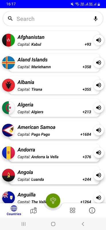 Este aplicativo fornece informações como capital, código do país, capital do país ISO, código da moeda, nome da moeda, continente, idioma, bandeira do país, pesquisa rápida por voz do país, pronúncia do nome do país, etc.