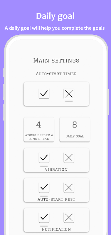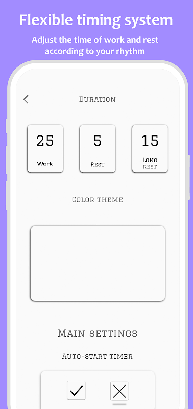 Configurações de Tempo Flexíveis: Personalize intervalos de trabalho, pausas curtas e pausas longas para combinar com seu estilo de trabalho e preferências pessoais. Adapte a técnica aos seus padrões de produtividade exclusivos.
