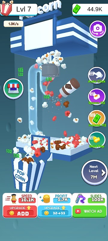 Bem-vindo ao "Popcorn Rush"! É um jogo incremental viciante que permite que você experimente a emoção de ser um magnata das máquinas de pipoca!