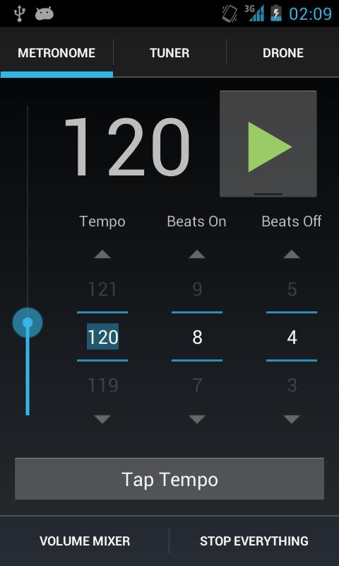 A free, easy to use, collection of smaller apps for musicians to use while practicing. Allows simultaneous use of its components, so the user does not need to open up separate apps for each part. Contains a tuner, pitch drone, and advanced metronome which allows users to improve their internal time-keeping by alternating specified periods of clicks and silence.