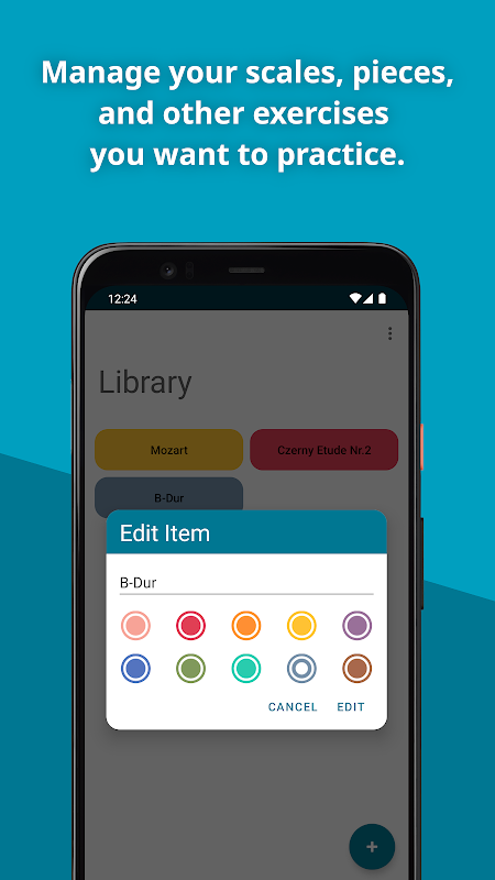 Defina e gerencie seus itens de prática (escalas, peças e outros exercícios...).