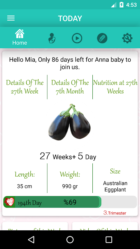 ● O seu dia aos detalhes gravidez dia. Ele fornece informações sobre o desenvolvimento de seu bebê, mudanças em seu corpo, dieta e exercícios para 280 dias.