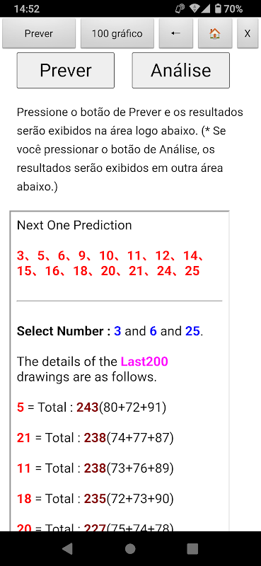 Ao clicar no botão de análise, você pode verificar a compatibilidade de cada número selecionado com outros números com as mesmas configurações de quando faz uma previsão.