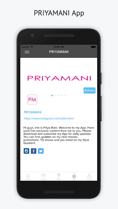 Hi guys, this is PriyaMani. Welcome to my App. Here you'll find exclusive content from me to you. Please download and subscribe my App for daily updates. You can find updates on my new movies, promotions, TG shows and the latest on my Style Quotient.