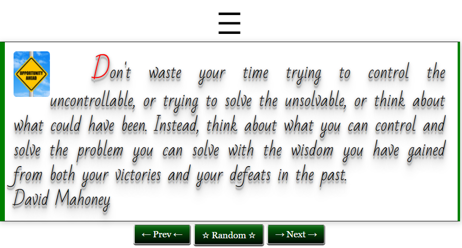 Para ler uma nova cotação e obter inspiração e motivação que você pode clicar no botão anterior, próximo ou aleatória. Para explorar citações de outros autores famosos, pensadores, Celebridades, personalidades e pessoas bem sucedidas usar o Menu.