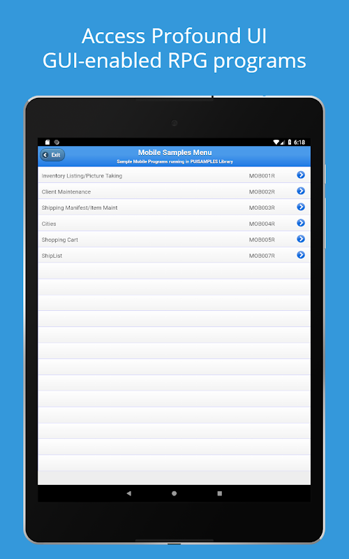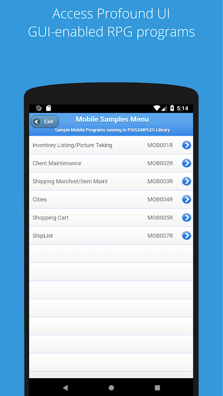 A profunda Cliente UI Mobile permite aos usuários acessar informações armazenadas em um servidor IBM i, através da utilização de um dispositivo Android. IBM i dados podem ser recuperados, atualizados e / ou integrado com recursos do dispositivo nativas, como a câmera para fazer o upload da foto.