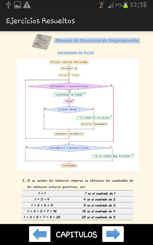 * Al finalizar cada capitulo podrás poner en practica tu conocimiento mediante un TEST DE PREGUNTAS que sera calificado... finalmente podrás revisar el repositorio de Ejercicios Resueltos sobre Algoritmos, Pseudocodigos y Diagramas de Flujo todo esto en una sola aplicación!!.