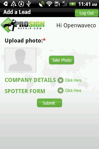 The ProSignRepair.com – Mobile Sign Spotter is an application designed for authorized users of the website to find and enter specific details for local electrical sign outages. The application enables the users to photograph an electrical sign at night, automatically enters the address information using GPS technology and asks 5 specific sign repair questions to complete a lead submission. The five questions are… 1. Sign Type 2. Visible damage / physical description of the outage 3. Height of the sign 4. Potential Obstacles to lift equipment 5. An area for custom notes and/or comments Once submitted, the information is uploaded to the ProSignRepair.com website and is available in an easily searchable format. Visitors, who have been notified with a custom printed notice, can visit the website to see what their sign looked like the night before and find out what their cost would be to have the sign repaired. The application requires a login & password for security and references the website for authorization to use the app. The application also references the site to confirm that the location of the lead is within the users authorized area to submit a lead.