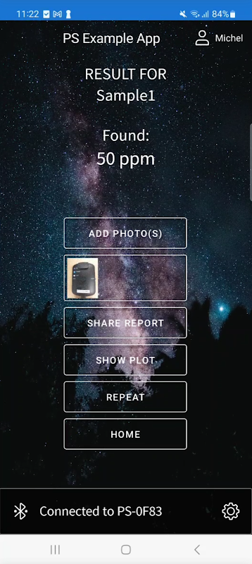 O PSExampleApp é um aplicativo simples de código aberto que orienta o usuário a fazer uma medição com um instrumento PalmSens para medir as concentrações em uma amostra (líquida). O aplicativo pode ser reconfigurado sem código para uso com (bio)sensores que medem um analito específico usando uma curva de calibração linear.