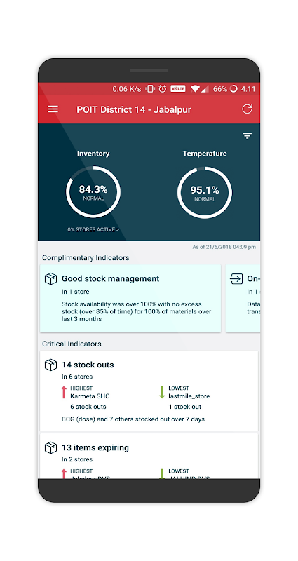 A aplicação permite monitorar a disponibilidade e inventário de equipamentos de rede de frio temperaturas, se as houver, por meio de um painel interactivo. Também resume de forma concisa vários eventos importantes na cadeia de abastecimento, tais como saídas de ações ou quase expiração, que ainda não foram postas em prática pelos indivíduos correspondentes gerenciamento de inventário. Estes permitem a entender rapidamente problemas críticos na cadeia de abastecimento que precisam de atenção imediata, e ajudar a impulsionar a prestação de contas mais forte, as ações humanas em tempo hábil, e, consequentemente, o bom desempenho da cadeia de suprimentos.