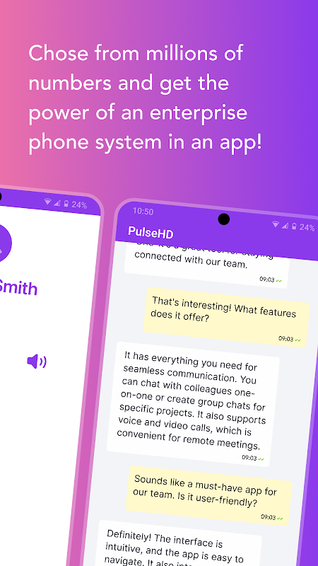 Simples e fácil de usar, o aplicativo PulseHD transforma seu telefone em um telefone comercial, acessível de qualquer lugar, a qualquer hora.