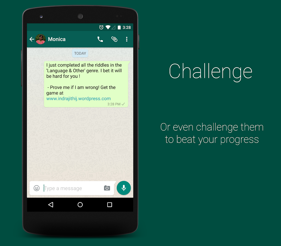 With puzzles, riddles and brain teasers all in one place, this game is one's best time-pass. It has over 500 riddles & puzzles in over 6 genres, all at one place! give your brain some work. Give it some riddles & puzzles to solve. Share a riddle or your progress with your friend. You can even challenge your friend to answer a particular question or an entire genre.! Besides, the flexibility of the app's layout using the Material Design paves way for it to flow across various screen sizes in a more fluid manner.