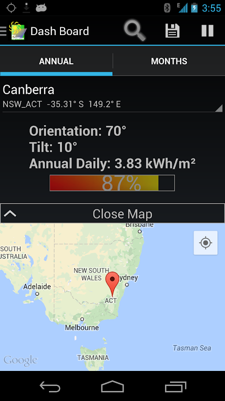 • Instant feedback indicating the percentage of maximum energy output that would be generated for the particular tilt and orientation in the specified location.